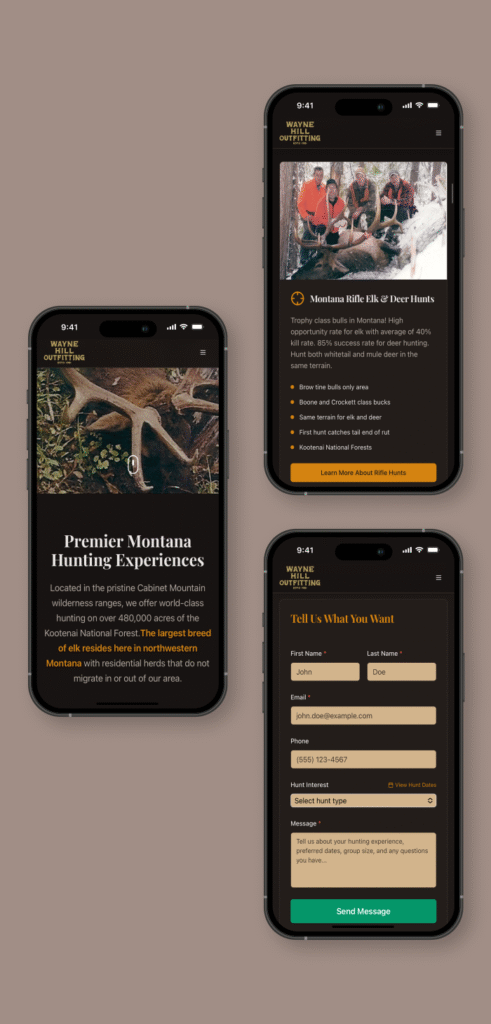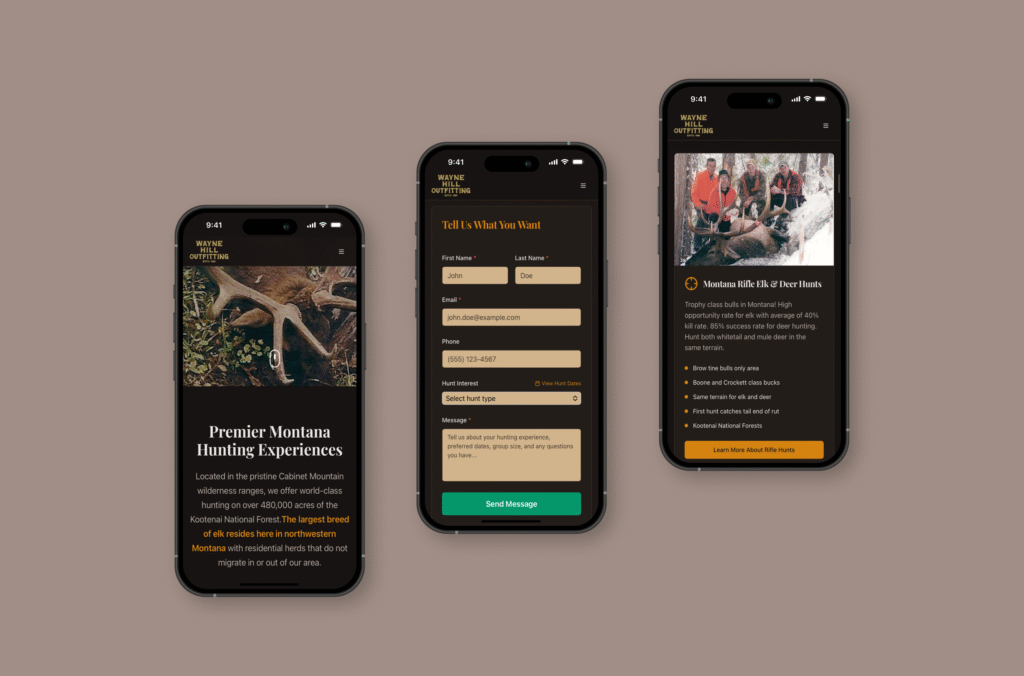 A digital presence for an outfitting company specializing in hunting and travel experiences. The aim was to convey the excitement of the outdoors, present available trips with clarity, and provide visitors with a seamless path to learn more, connect, and book their adventure